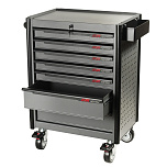 С 7 ящиками. Округлая форма бортовой ручки тележки. Корпус тележки оснащен защитными бортами, что сводит к минимуму риск повреждения оборудования и нанесение травм автомеханикам во время перемещения по СТО. Выдвижные ящики оснащены нескользящими вкладками. В комплекте предусмотрен верхний коврик из EVA, предназначенный для удобного хранения различных мелких деталей. Роликовые направляющие с функцией автоматического возврата обеспечивают плавность открывания/закрывания ящиков. Максимально возможная нагрузка на тележку: 450 кг.